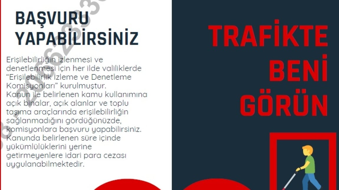 Bakanlığımız Özel Öğretim Kurumları Genel Müdürlüğü karayolu trafik güvenliği eylem planı kapsamında "Engelli ve yaşlı bireylerin trafik güvenliğinin sağlanması konusunda toplumun diğer kesimlerinde farkındalığın artırılması"na ilişkin somut ilerleme sağlamak amacıyla "Trafikte Beni Görün" bilgilendirme broşürü yayımlamıştır. Borşüre ulaşmak için linke tıklayabilirsiniz. meb_iys_dosyalar/53/08/193633/dosyalar/2025_05/02102124_trafiktebenigorunbrosur2025.pdf